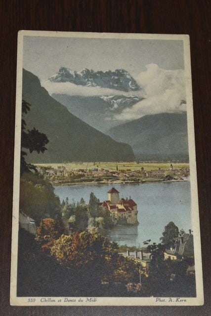 Old postcard of Chillon et Dents du Midi, photo by A. Kern