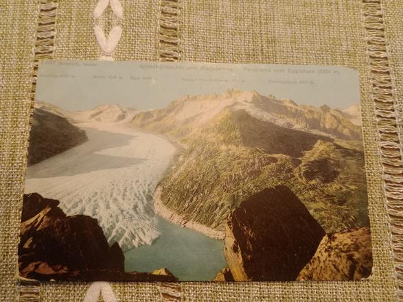 Offering an old historical photochromatic postcard of the Aletsch Glacier with a panorama. The postcard is old and the corners are bumped. The postcard is unused and has no stamp.
