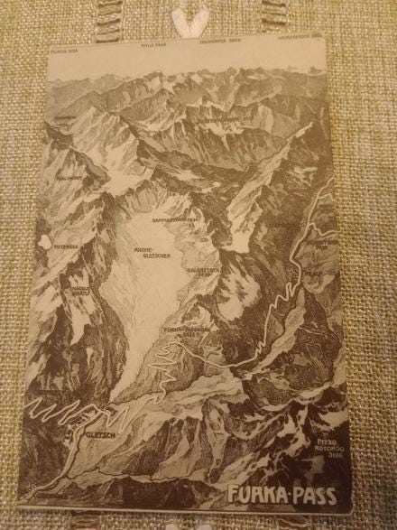 Offering old and well-preserved postcard panorama map of the Furka Pass. The card is unused and does not contain a stamp.