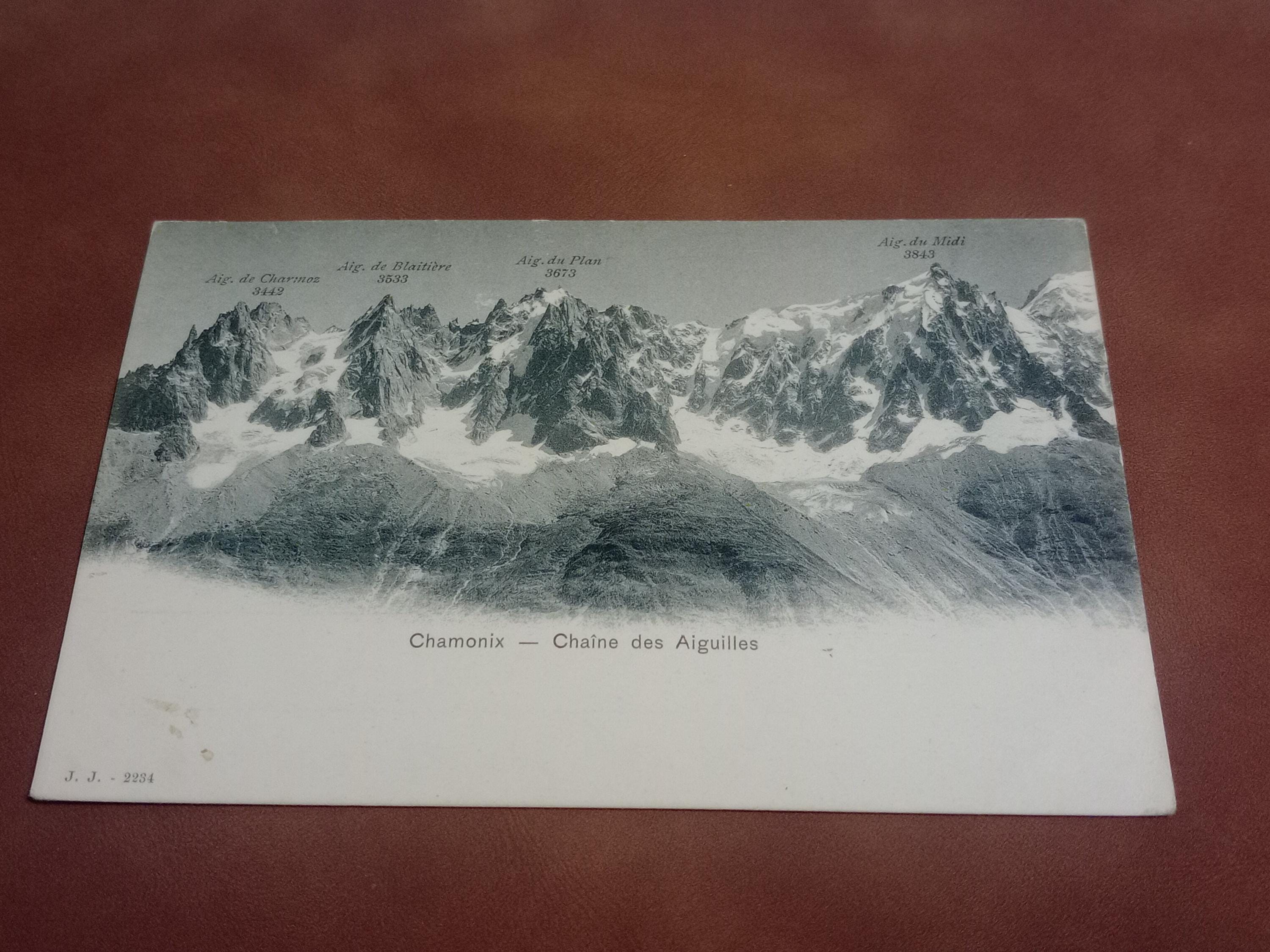 In a world dominated by digital media, it's fascinating to glimpse the past and experience the beauty of a vintage postcard. This panoramic postcard of Chamonix, dating from around 1900, depicts majestic mountains rising from the French Alpine landscape. In particular, the impressive peaks of the Aiguille de Charmoz (3442 m), Aiguille de Blaitière (3533 m), Aiguille du Plan (3673 m), and Aiguille du Midi (3842 m) captivate the viewer.