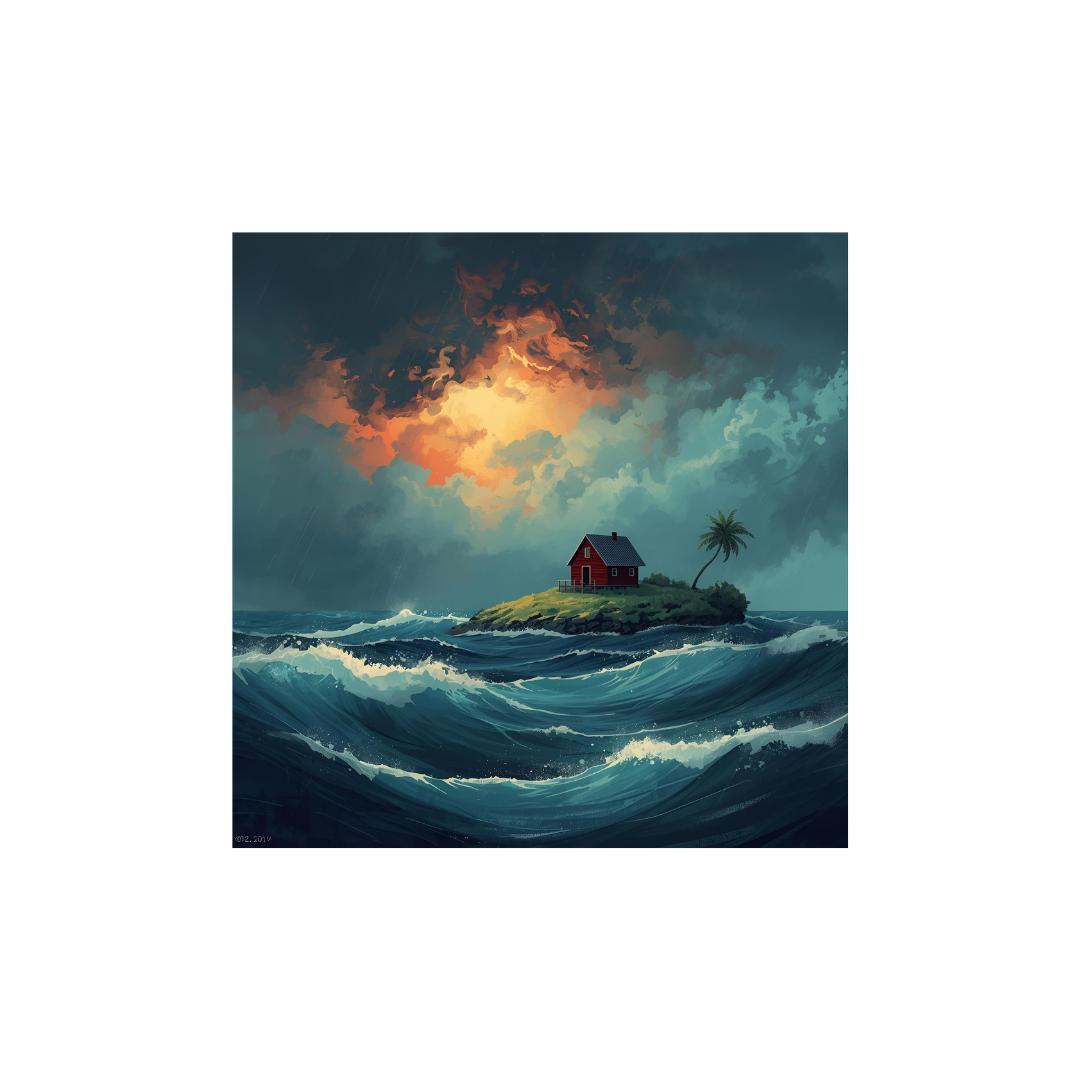 "Discover the Hidden Gem! Our digital print of a red cottage on a deserted island is waiting for you – download it now!"