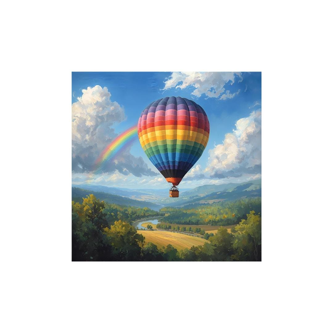 Vintage Balloon with Rainbow Art Print. This high-quality AI digital download captures a dreamy fantasy landscape featuring a vintage-style hot air balloon floating beneath a radiant rainbow. Perfect for nurseries, playrooms, or art lovers who adore imaginative and uplifting wall decor.