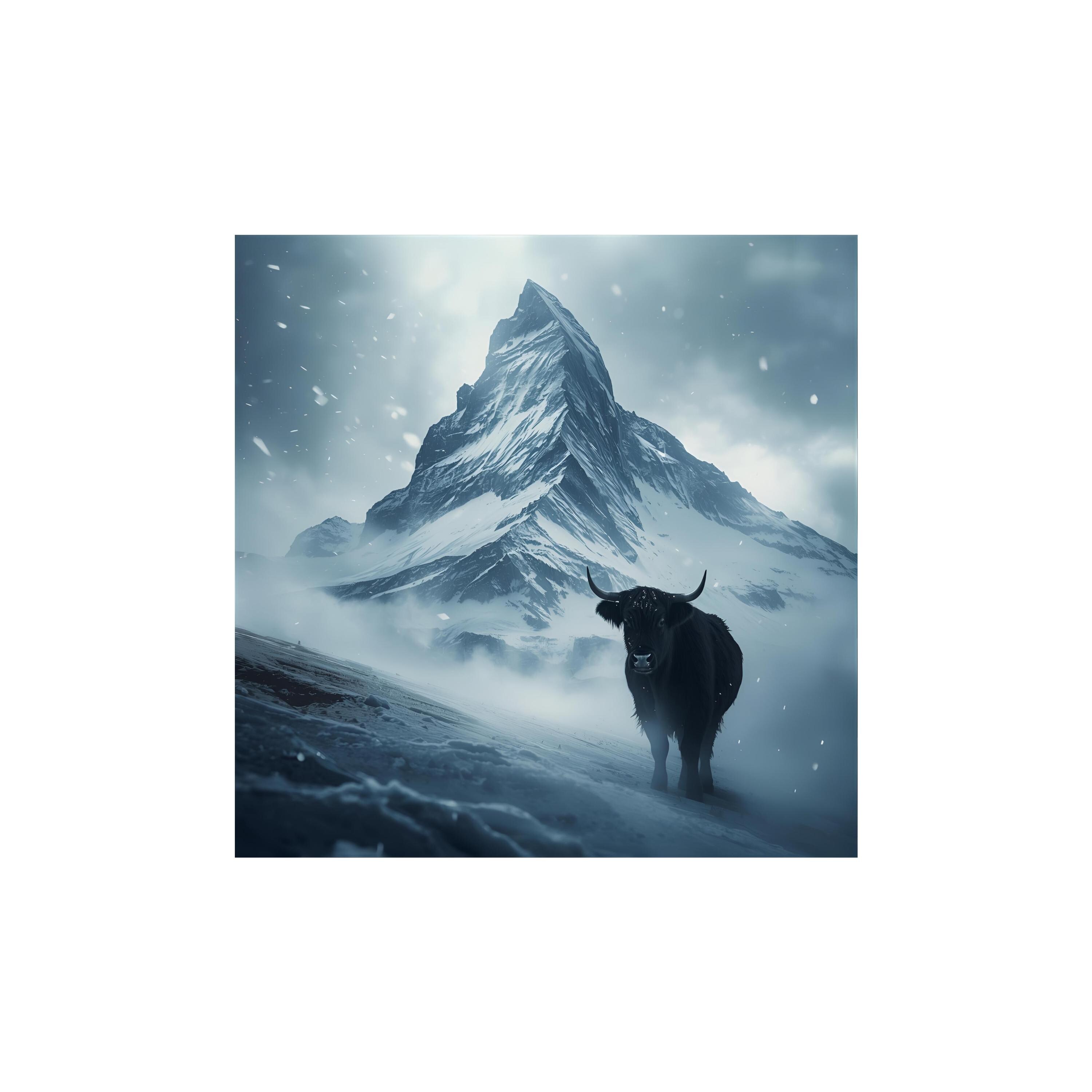 ai mountain art, snowy peak print, yak wall decor, winter scene art, misty nature art, alpine wall art, ai landscape art, frozen decor art, cold mountain art, digital wild art, ai poster print, scenic wall art, snowy decor art