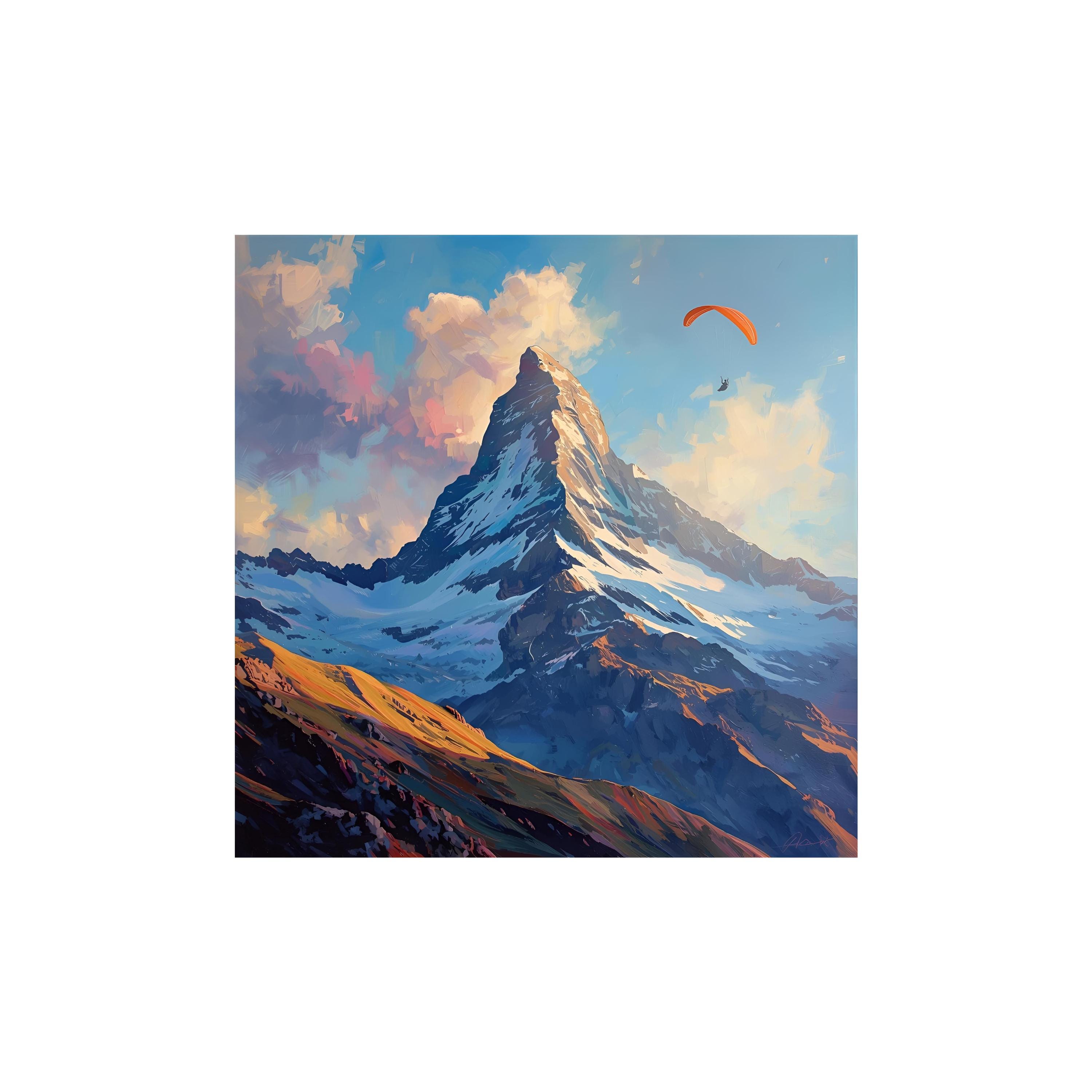 sunset mountain art, paraglider poster, snow peak print, nature wall decor, alpine view card, adventure scene file, vibrant sky sketch, matterhorn artwork, outdoor travel art, scenic summit file, digital wall print, rugged terrain look, sunrise peak photo