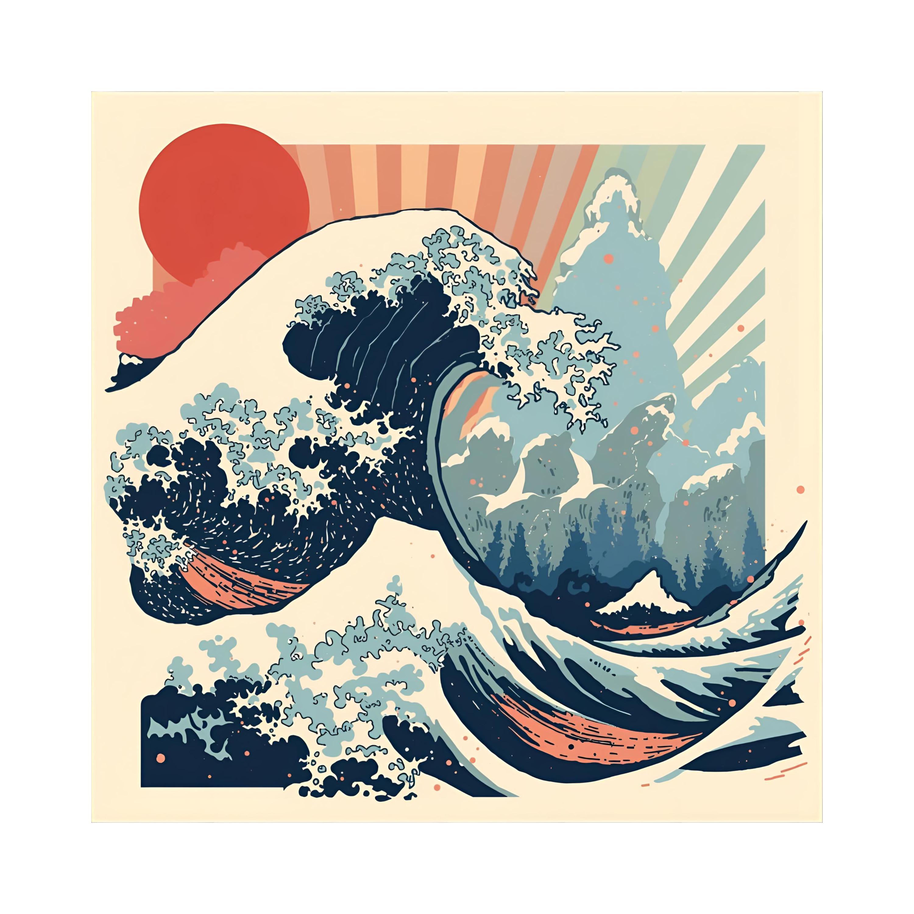 wave art print, retro ocean art, kanagawa decor, bold wall poster, japanese sun art, ai digital sketch, ocean burst print, rising sun file, stylized wave art, modern japan look, digital wall file, abstract sea decor, vintage surf poster
