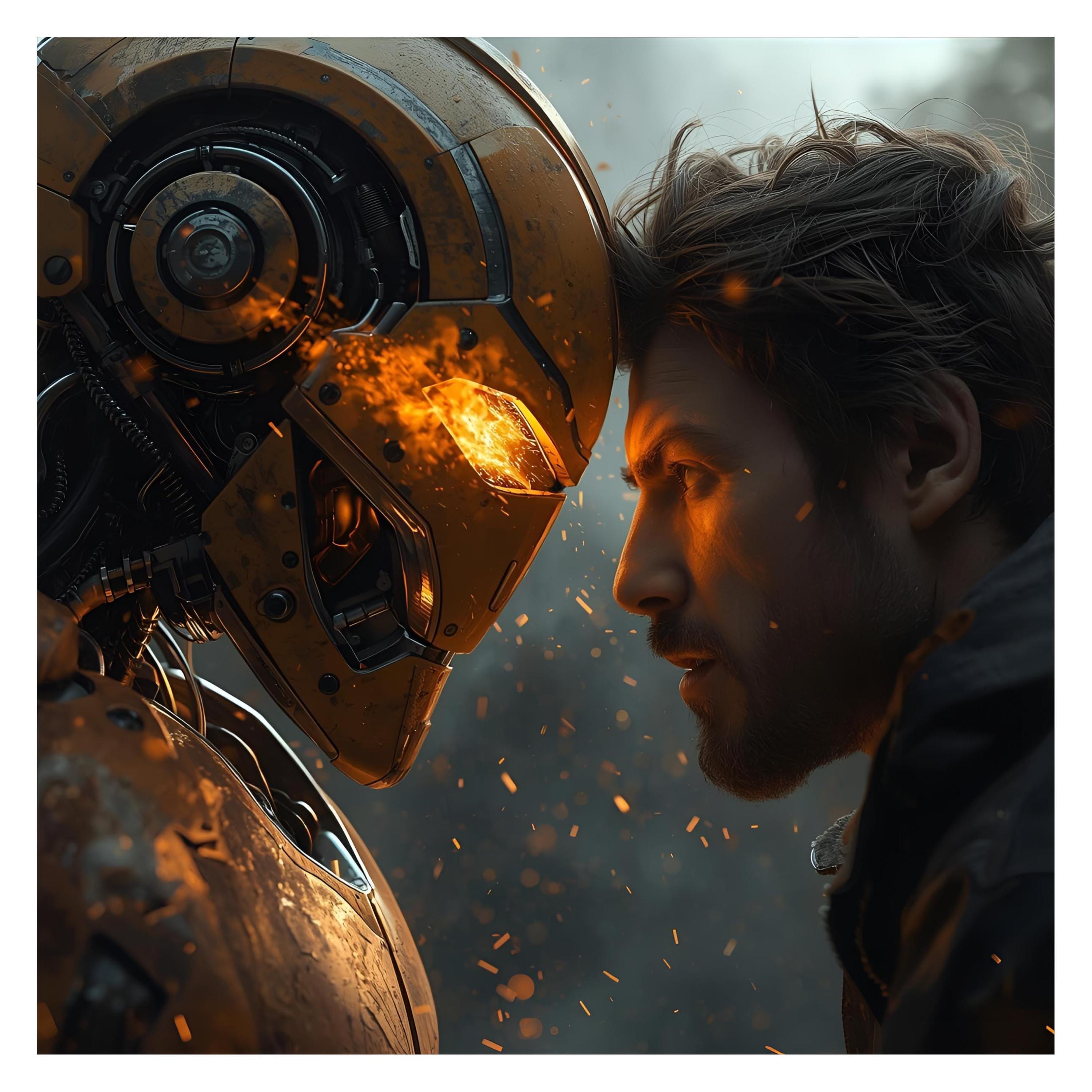 This AI Man vs Robot Art, a stunning digital illustration that explores the connection and tension between man and machine. This futuristic sci-fi artwork blends bold design, vibrant detail, and deep symbolism to create a mesmerizing visual story.