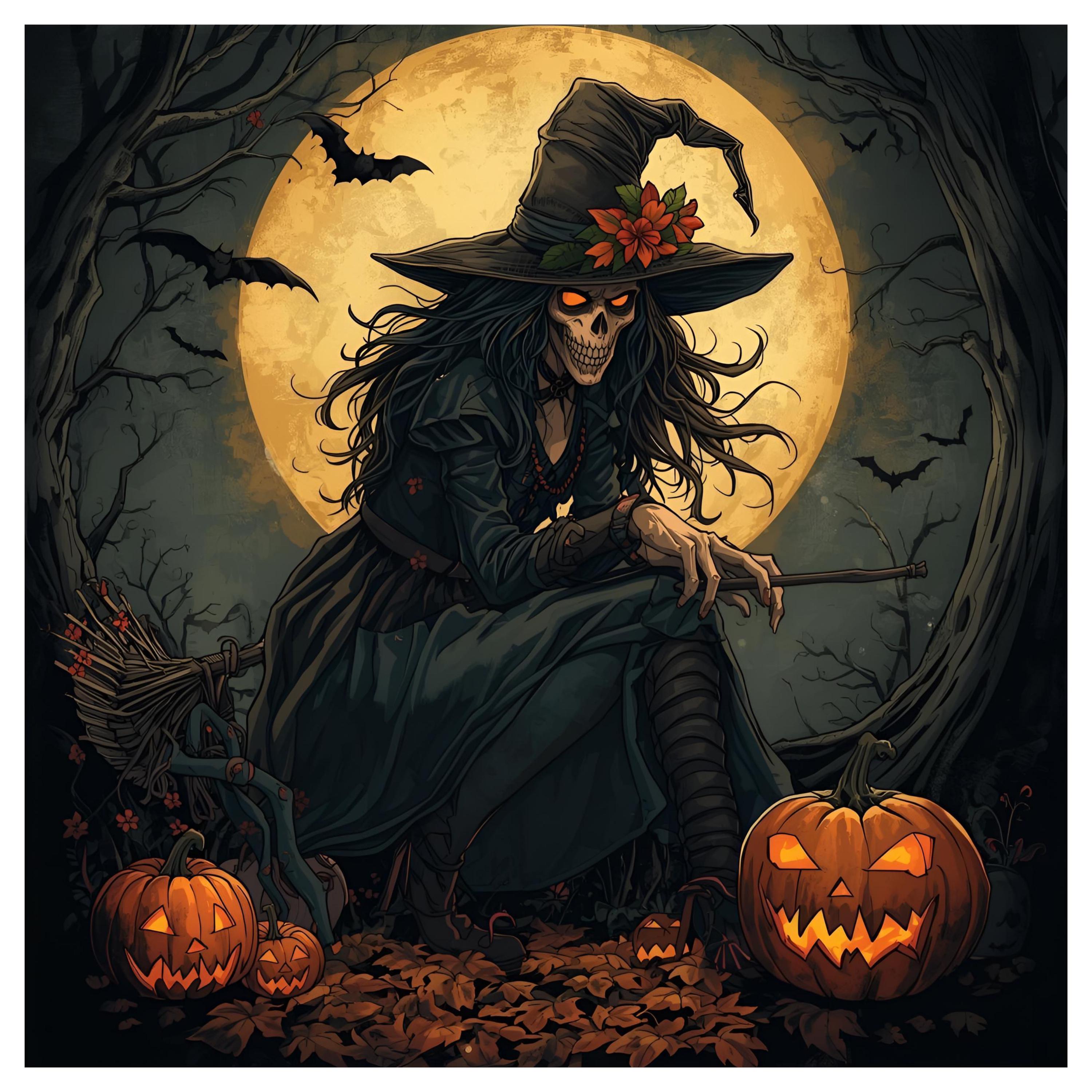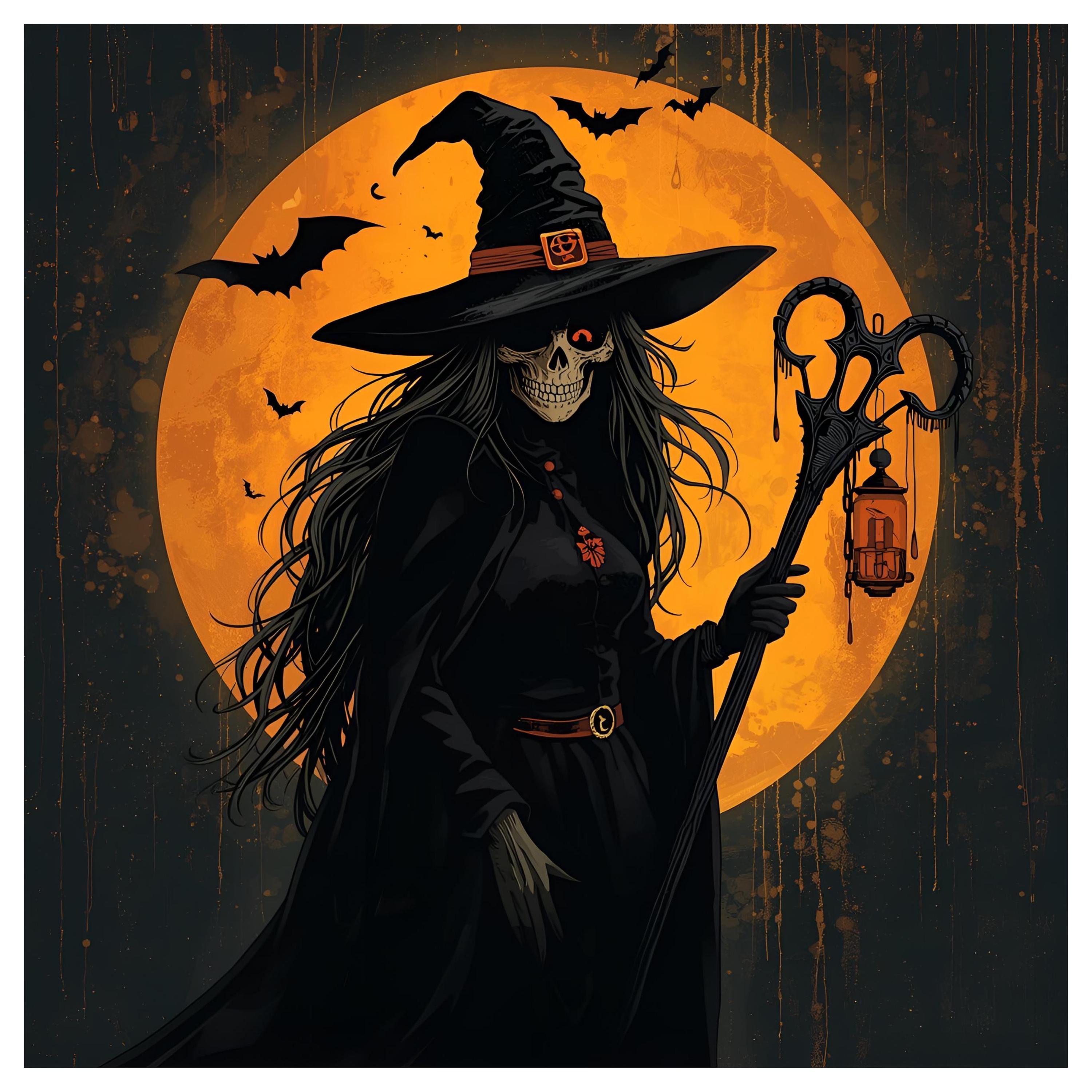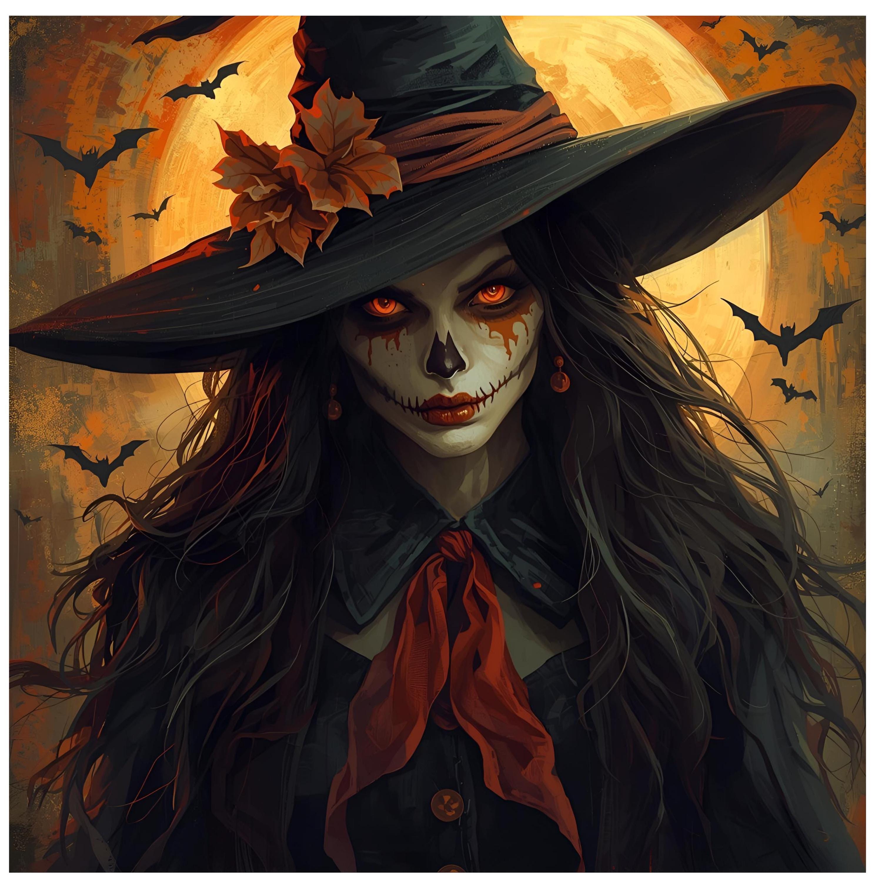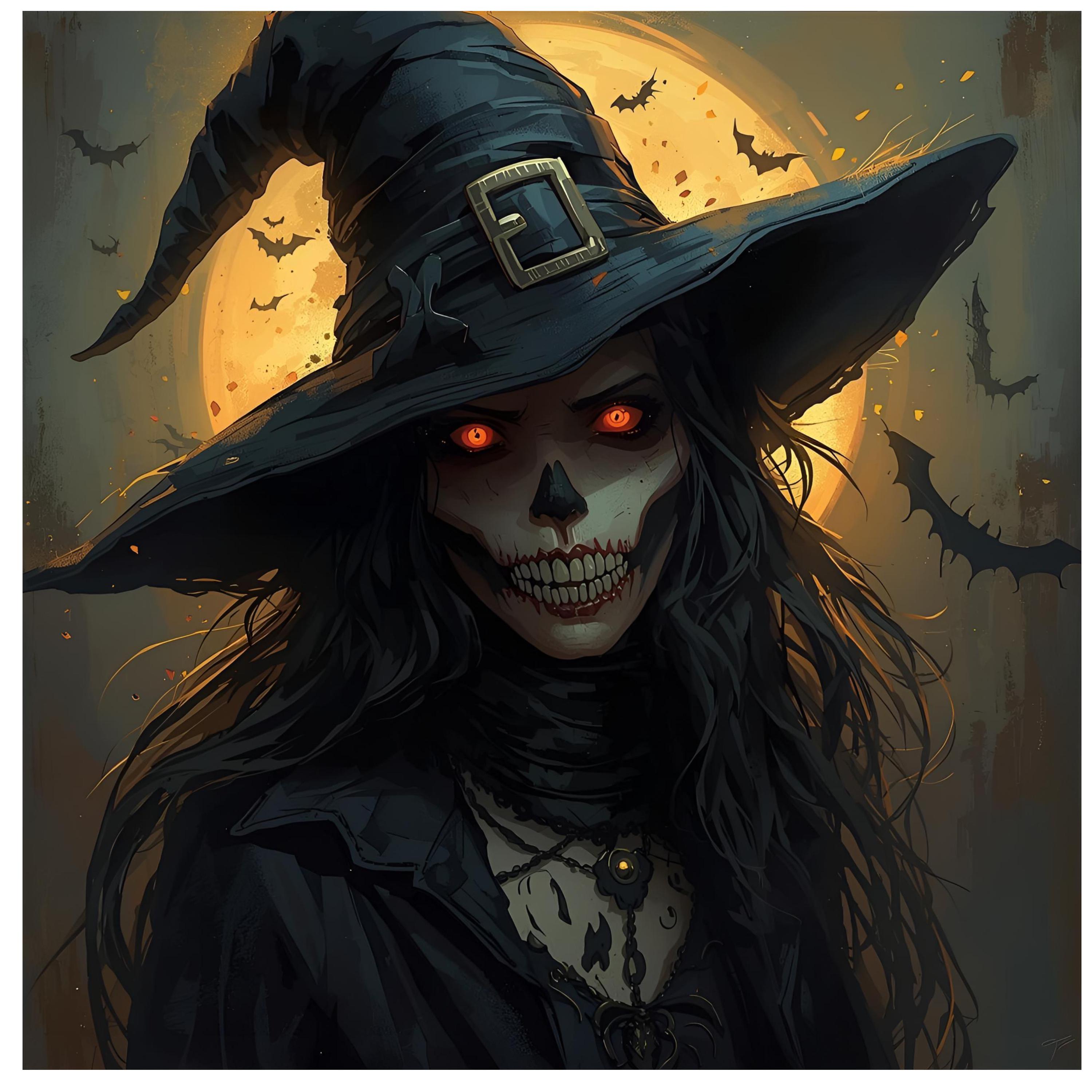 This Gothic Witch Woman Art Print. This digital artwork captures the essence of Halloween magic, featuring a hauntingly elegant witch under a glowing full moon surrounded by flying bats. With a perfect balance of mystery, fantasy, and gothic charm, this piece instantly transforms your home into a spellbinding atmosphere.