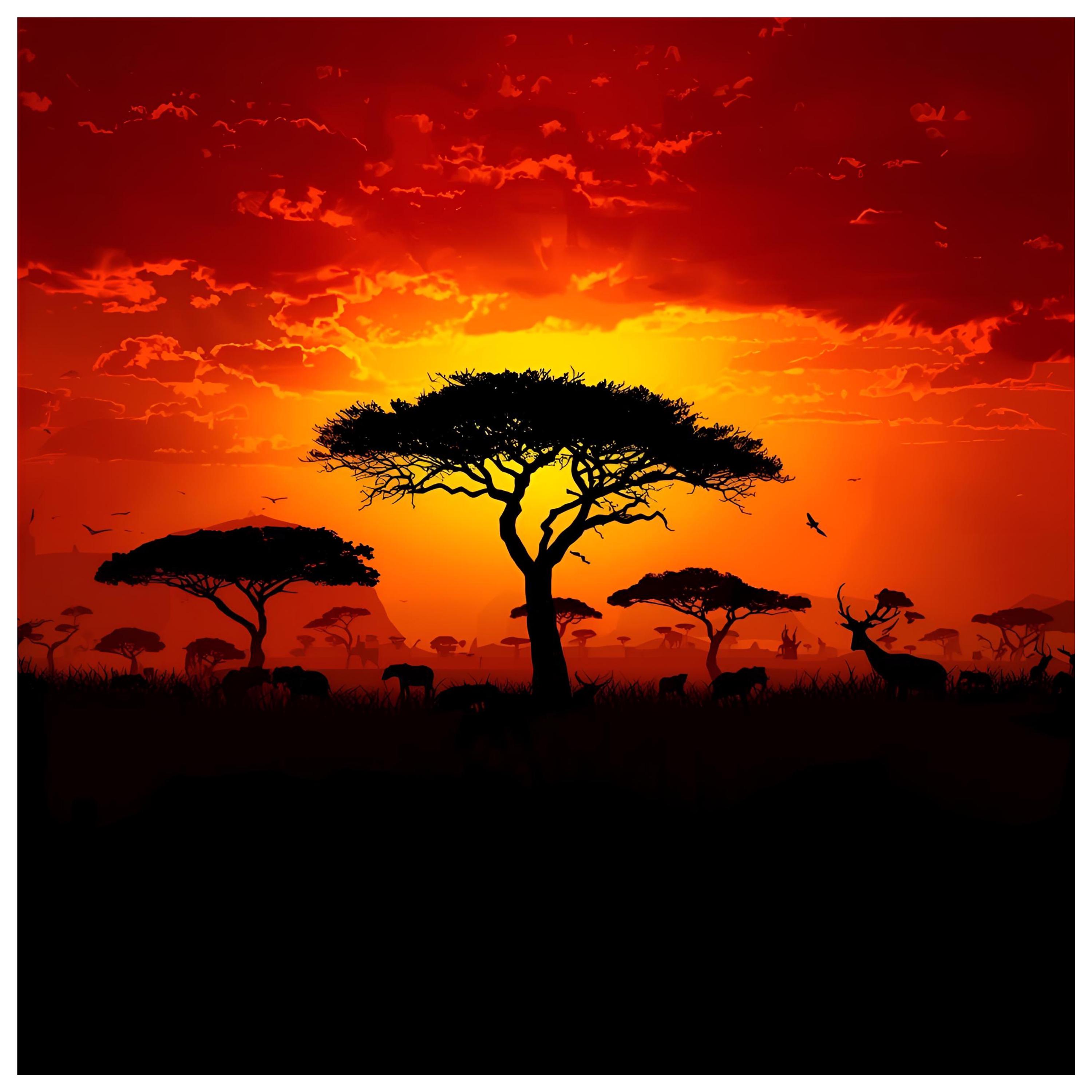 This African Sunset Wall Art captures the breathtaking beauty of an African savanna at dusk — glowing red skies, elegant animal silhouettes, and a golden horizon that radiates calm and majesty. Perfectly detailed and digitally rendered, this artwork brings the tranquil yet powerful essence of Africa into your home.
