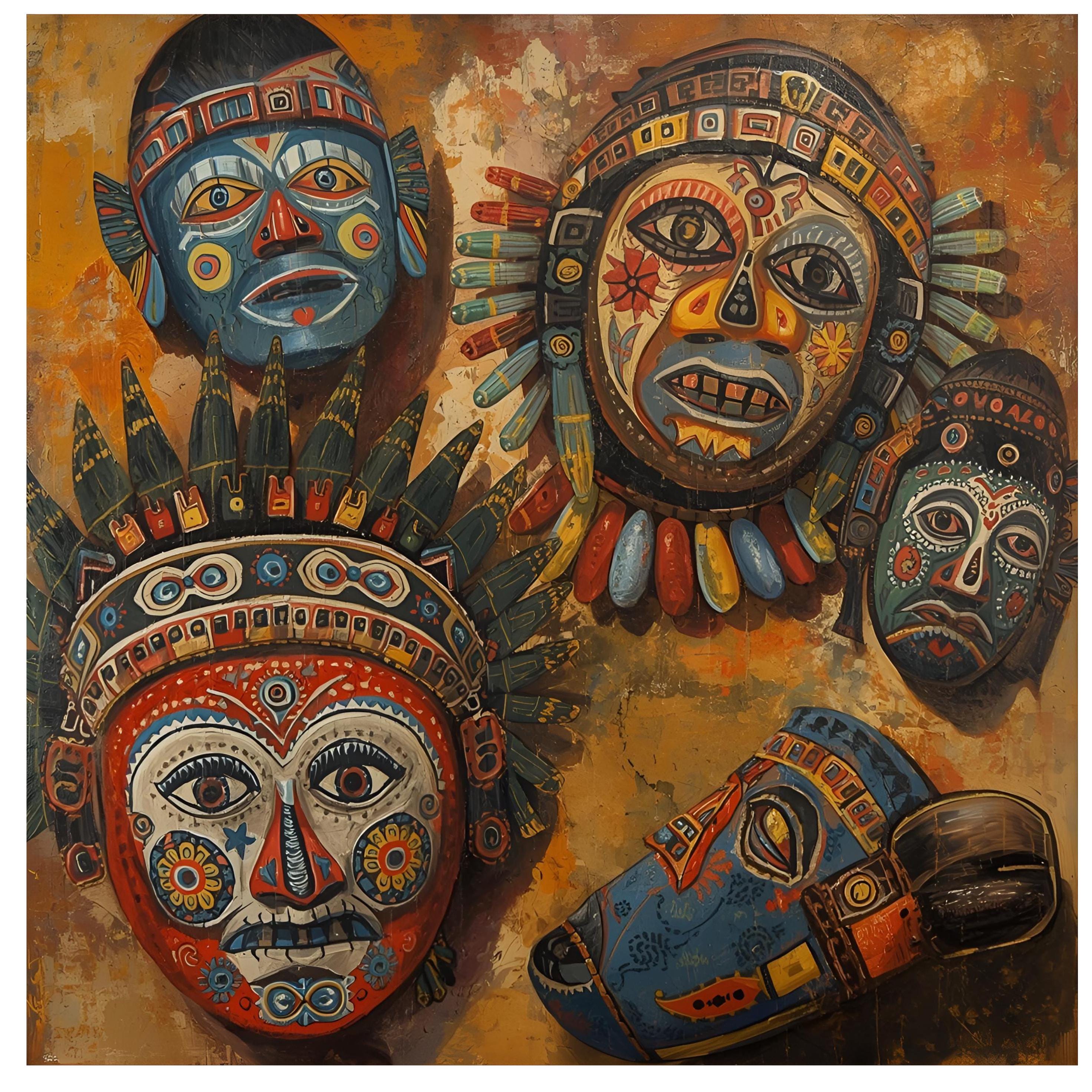 South America Ecuador Masks Digital Art | South American Folk Art Style | Colorful Ethnic Wall Decoration, Tribal Motif, Unique Home Decor