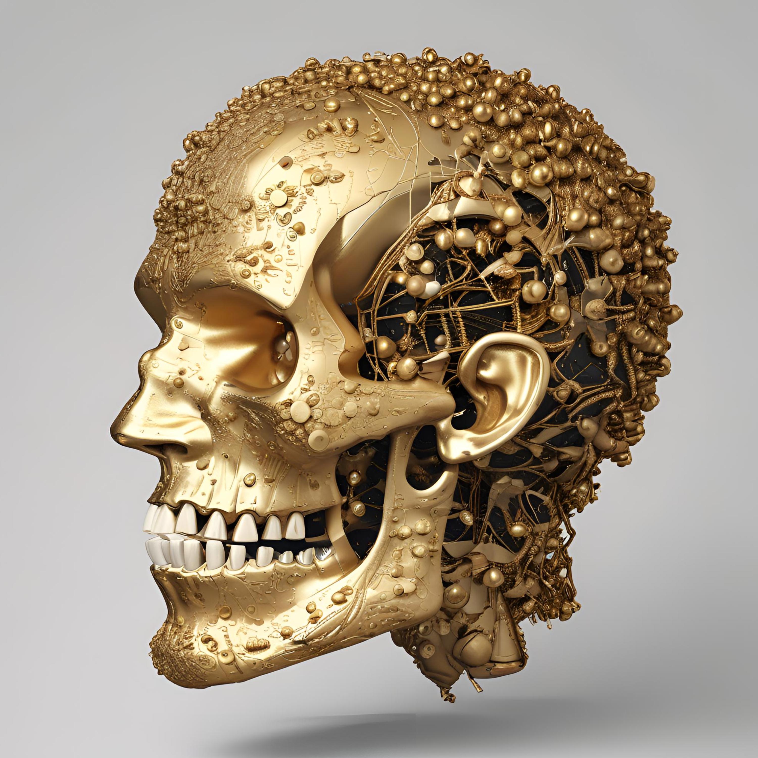 ai digital art, gold skull art, cyberpunk decor, 3d wall print, futuristic skull, modern tech art, metallic artwork, digital sculpture, ai skull print, surreal design, unique wall art, abstract decor, golden anatomy